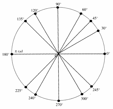 5. Sur le rapporteur suivant, après avoir converties en radians les mesures indiquées en degrés, placer (à main levée) les mesures correspondant à 1rad, 2rad, 3rad, 6rad.